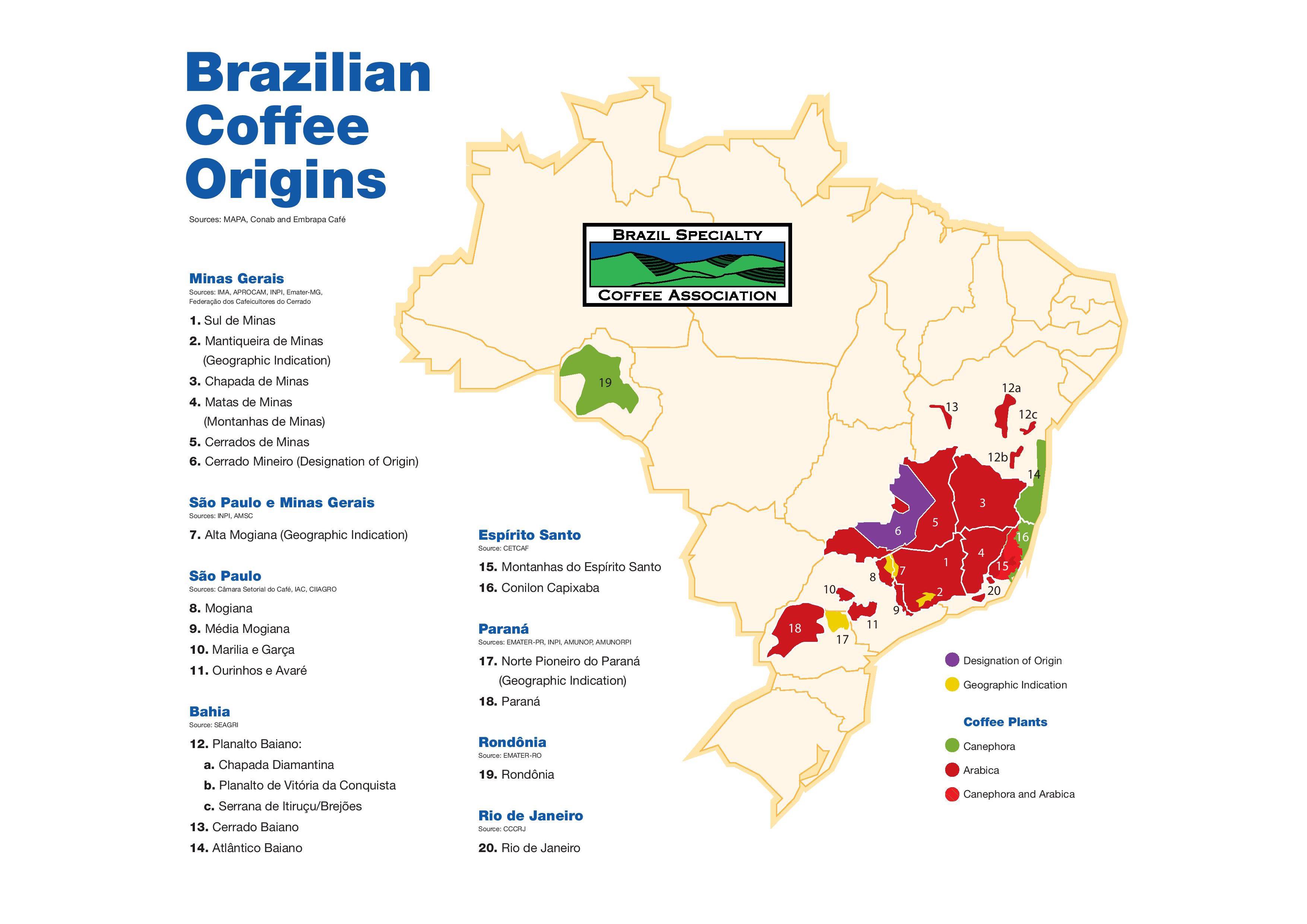 Map of Brazil coffee. Brazil coffee map (South America - Americas) to print. Brazil coffee map (South America - Americas) to download. Some of the most popular coffee in the world originates in South America, and perhaps no country in the region does it better than Brazil. Since the 1840s, Brazil has been the largest player in the international coffee trade. Today, the country produces 40 to 60 million bags annually as its shown in Brazil coffee map, and is also known for being the world’s largest exporter of instant coffee.